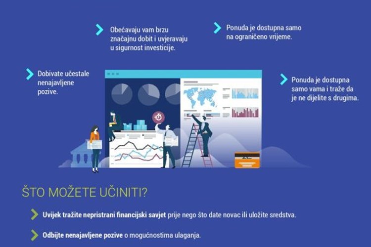- budite sumnjičavi prema ponudama koje obećavaju sigurnu investiciju, zajamčene povrate i veliku dobit,